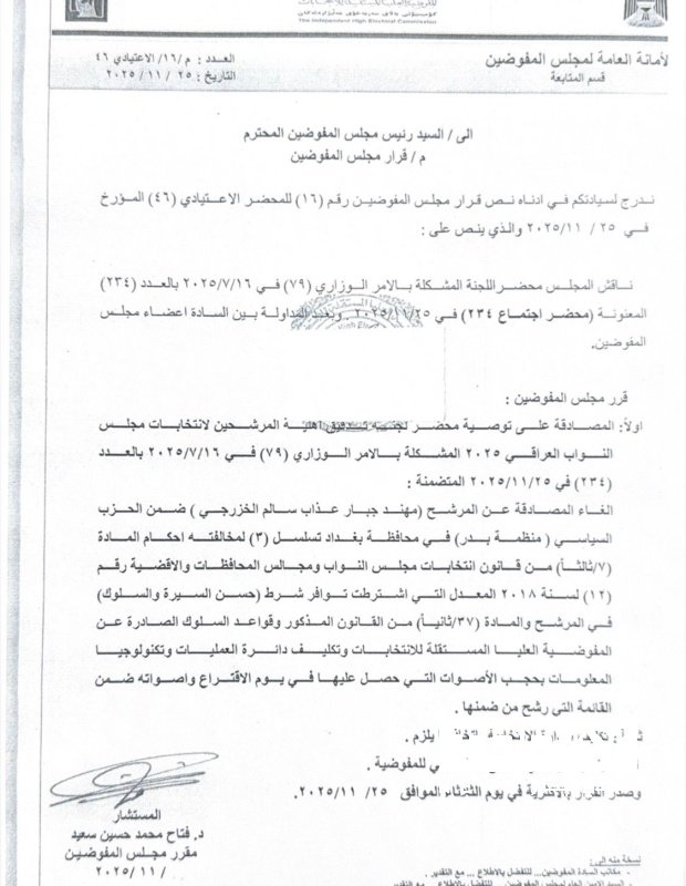 الغاء المصادقة عن المرشح (مهند جبار سالم الخزرجي ) ضمن الحزب السياسي (منظمة بدر) في محافظة بغداد تسلسل (3) لمخالفته احكام المادة (8/ثالثاً ) من قانون انتخابات مجلس النواب ومجالس المحافظات والاقضية رقم 12 لسنة 2018 المعدل التي اشترط توافر شرط (حسن السيرة والسلوك) في المرشح والمادة (37/ثانياً ) من القانون المذكور وقواعد السلوك عن المفوضية العليا للانتخابات وتكاليف دائرة العمليات والتكنولوجيا المعلومات بحجب الأصوات التي حصل عليها في يوم الاقتراع واصواته ضمن القائمة التي رشح من ضمنها"