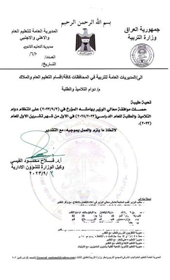 التربية تحدد موعد دوام التلاميذ والطلبة في عموم العراق