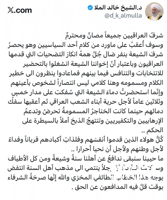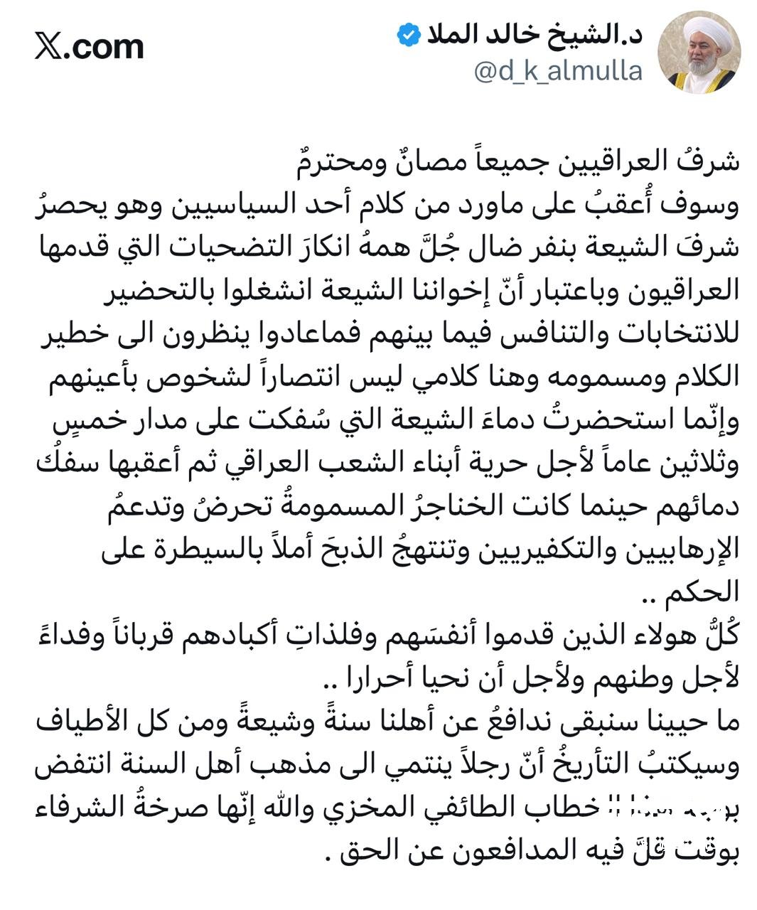 الملا يرد على أحد السياسيين .. شرف العراقيين جميعا مصان ومحترم
