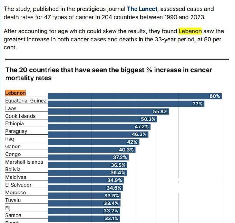 الدراسة التي نشرتها صحيفة ديلي ميل شملت 204 دول من بينها العراق، وأظهرت أن عدد حالات السرطان الجديدة تضاعف منذ 1990 ليصل إلى 18.5 مليون حالة، فيما ارتفع عدد الوفيات إلى 10.4 مليون حالة.