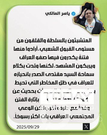 وقال المالكي في تدوينة عبر (X)، إن"الفتنة وئدت بكلام السيد الصدر بانحيازه للعراق في ظل المخاطر التي تحيط به".