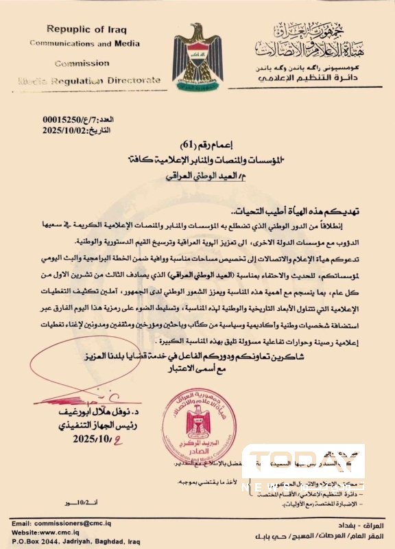 دعا رئيس هيأة الإعلام والاتصالات نوفل أبو رغيف ، اليوم الخميس ، جميع المؤسسات الإعلامية في العراق إلى تكثيف التغطيات الوطنية والاحتفالية بمناسبة ذكرى العيد الوطني العراقي.