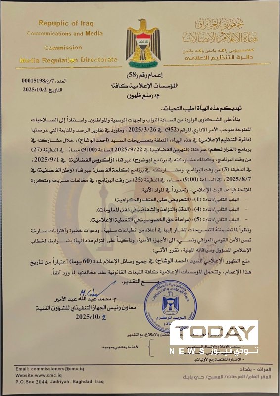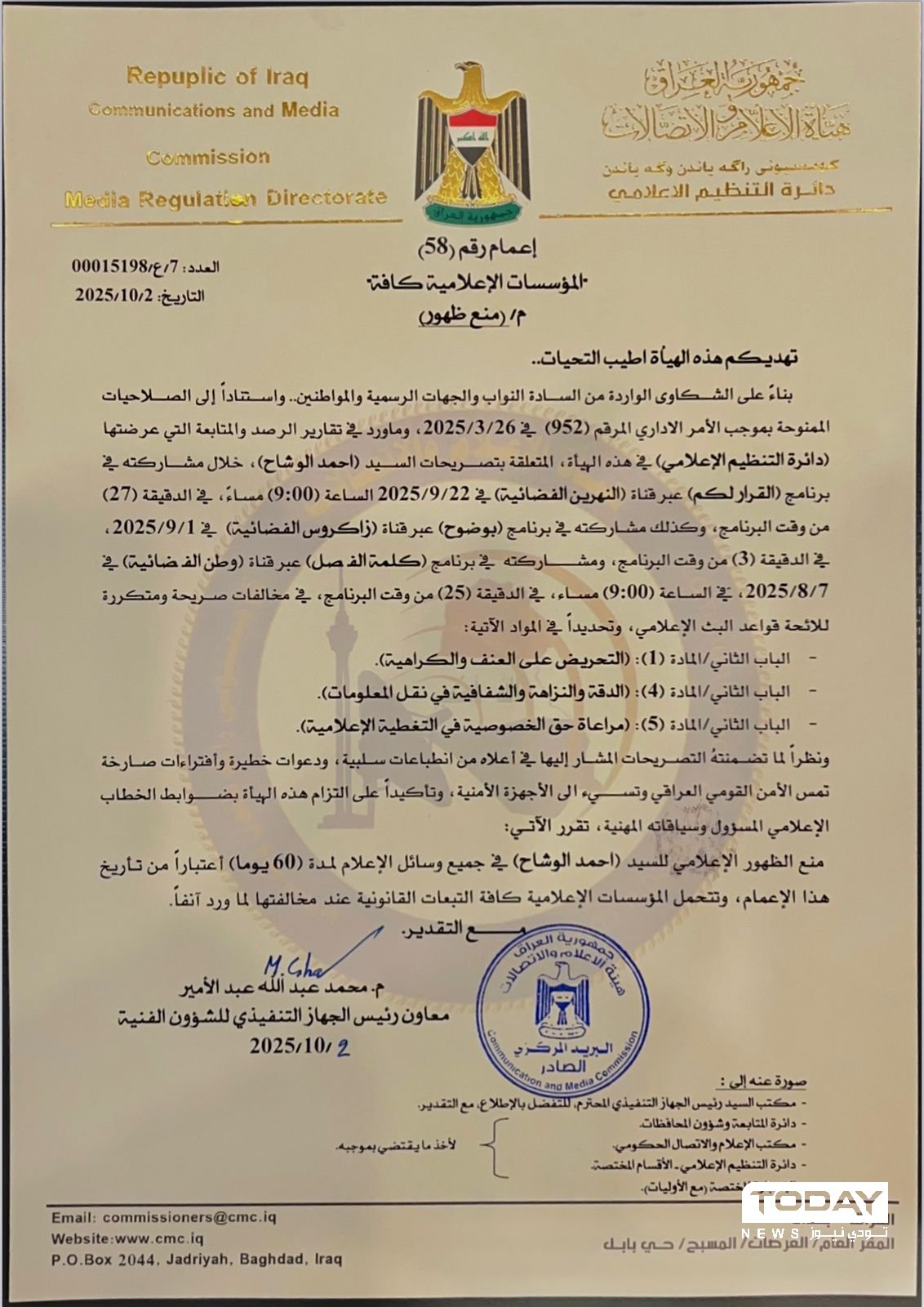 وثيقة .. هيئة الإعلام تمنع الظهور الإعلامي احمد الوشاح لمدة 60 يوما