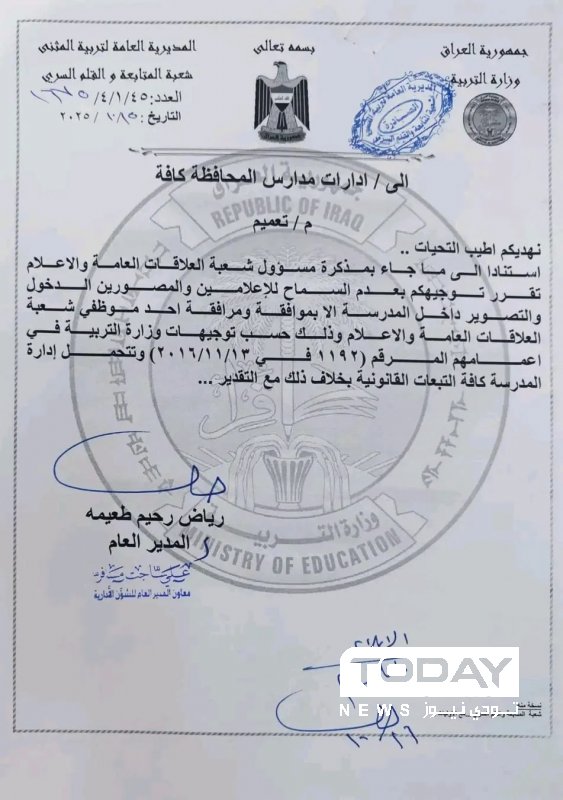 ووجّه الجبوري، وفق بيان صدر عن وزارة التربية ، المديريات العامة للتربية كافة بالالتزام التام بالضوابط الصادرة، محذراً من أن أي مخالفة ستعرض المديرية للتبعات والعقوبات القانونية المترتبة عليها.