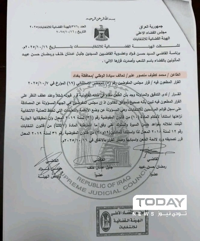 وبحسب وثيقة وردت لـ موازين نيوز، فأن مجلس القضاء الاعلى قرر ان القرار المطعون فيه بشأن استبعاد الدايني عن السباق الانتخابي صحيح وموافق للقانون .