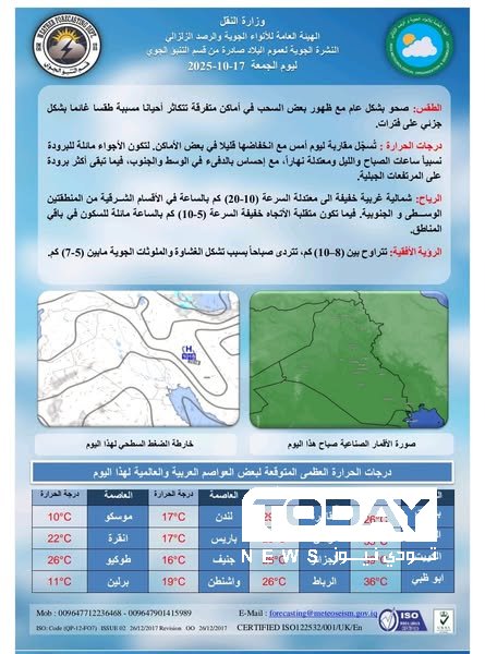 وذكر بيان للهيئة، تلقته موازين نيوزأن "غداً السبت سيكون الطقس صحواً مع بعض الغيوم، والرياح شمالية غربية خفيفة الى معتدلة السرعة تنشط في المنطقتين الوسطى والجنوبية مسببة تصاعد الغبار في بعض الأماكن منها، ودرجات الحرارة مقاربة لليوم السابق".