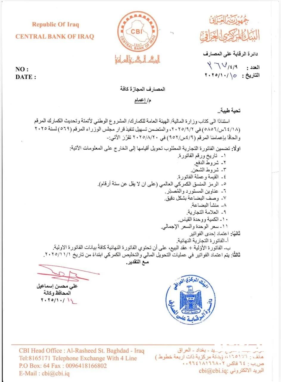 ويأتي هذا القرار في إطار جهود البنك المركزي العراقي والجهات الحكومية لتطوير البيئة المالية والإدارية، وتحسين مستوى الرقابة والامتثال للمعايير الدولية في التجارة الخارجية.