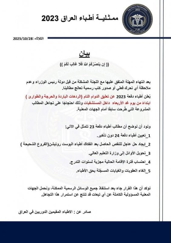 أطباء دفعة 2023 يعلنون تعليق الدوام التام في المستشفيات