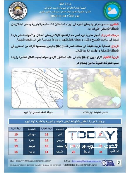 أعلنت الهيئة العامة للأنواء الجوية والرصد الزلزالي أن الطقس في عموم البلاد سيكون صحواً مع بعض الغيوم في المناطق الشمالية والجنوبية وبعض مناطق الوسط، فيما تستمر درجات الحرارة على حالها أو ترتفع قليلاً في بعض المناطق.