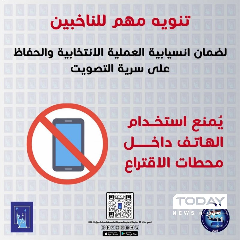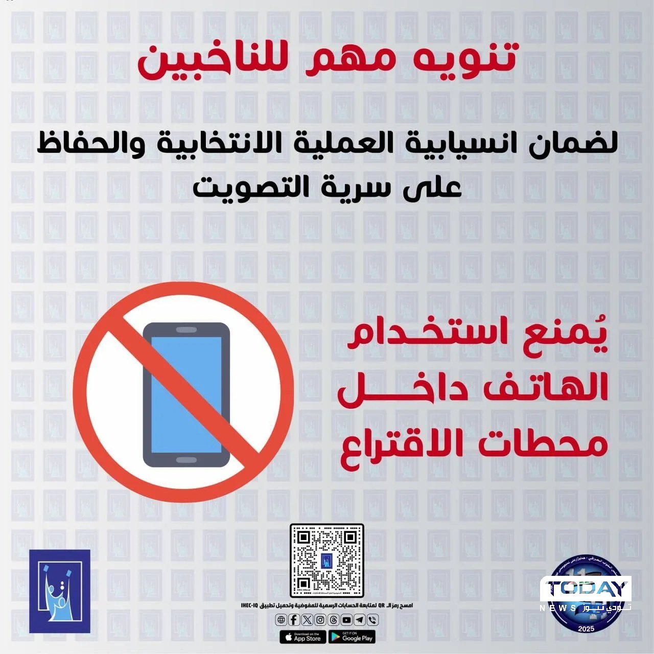 أكدت المفوضية العليا المستقلة للانتخابات منع استخدام الهواتف المحمولة داخل محطات الاقتراع، وذلك في إطار الإجراءات الهادفة إلى الحفاظ على سرية التصويت وضمان نزاهة العملية الانتخابية.