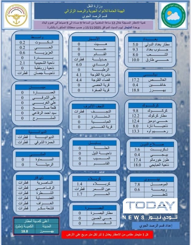 وأوضحت الهيئة في بيان لها ، "كمية الامطار المتساقطة في عموم المحافظات العراقية اعتباراً من الساعة 9 من مساء يوم أمس الجمعة، ولغاية الساعة 9 من صباح هذا اليوم".