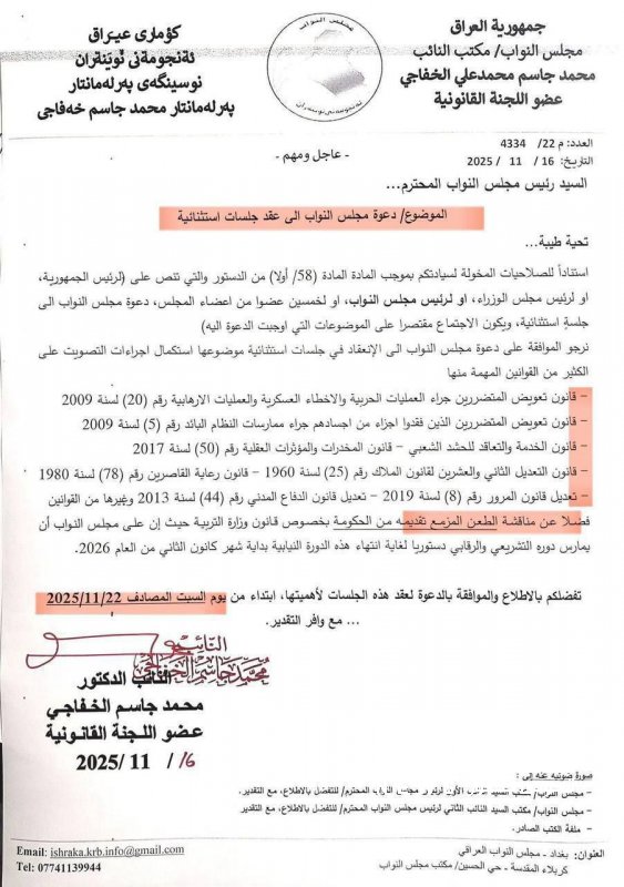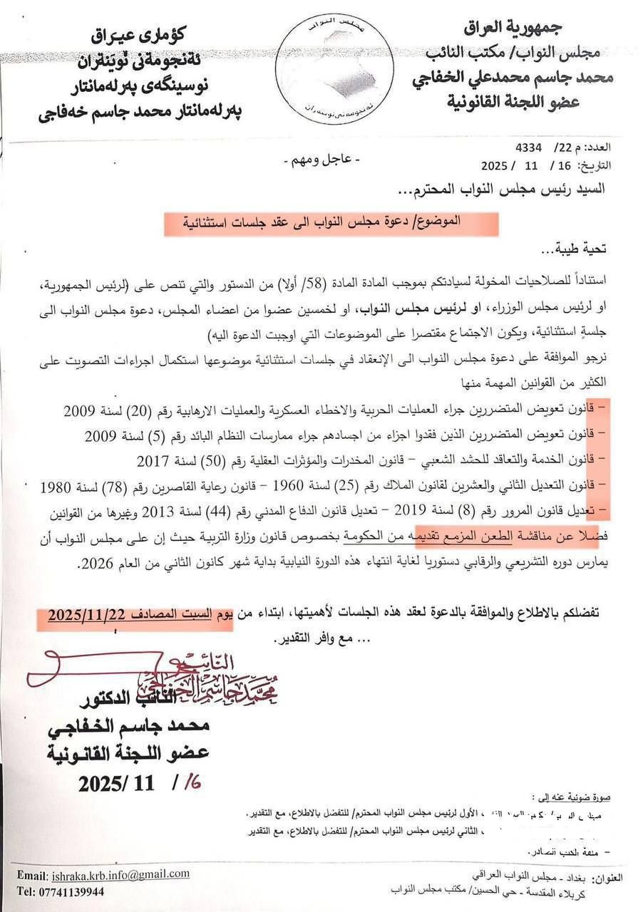 خاطبت اللجنة القانونية النيابية وفق ( وثيقة متداولة ) رئاسة البرلمان بعقد جلسة استثنائية، لاستضافة وزيرة المالية طيف سامي ومناقشة أسباب الطعن بقانون وزارة التربية، وإستكمال التصويت على الكثير من القوانين المهمة.