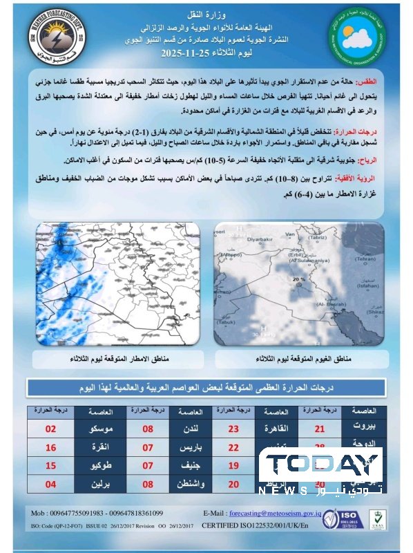 تشير توقعات الطقس في العراق، اليوم الثلاثاء ، الى أن الاجواء تكون غير مستقرة، حيث تتجمع السحب تدريجيا مسببة طقسا غائما جزئي يتحول الى غائم أحيانا، فيما تتهيأ الفرص خلال ساعات المساء والليل لهطول زخات أمطار خفيفة الى معتدلة، بينما تنخفض درجات الحرارة قليلاً في المنطقة الشمالية والأقسام الشرقية من البلاد.