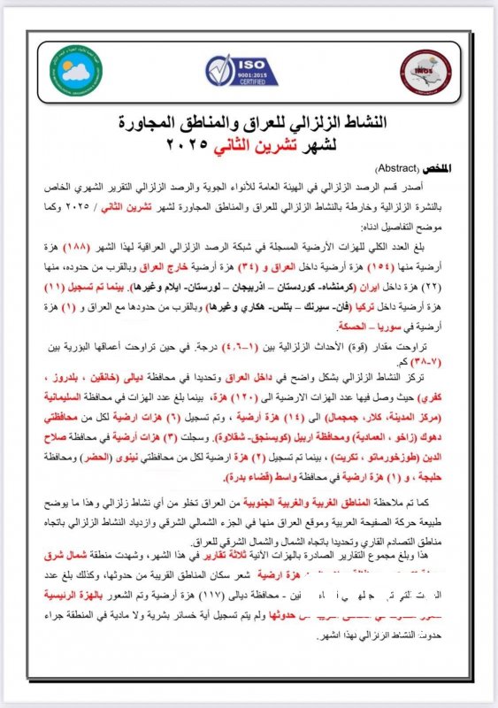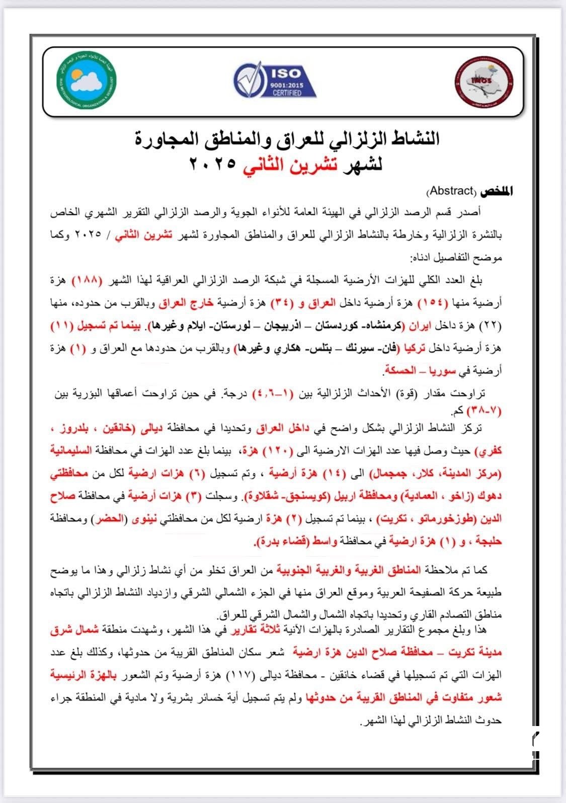 وقال القسم في بيان ان "التقرير الشهري الخاص بالنشرة الزلزالية وخارطة بالنشاط الزلزالي للعراق والمناطق المجاورة لشهر تشرين الثاني، تضمن تسجيل 188 هزة أرضية، منها 154 هزة داخل العراق و34 هزة خارج العراق وبالقرب من حدوده".