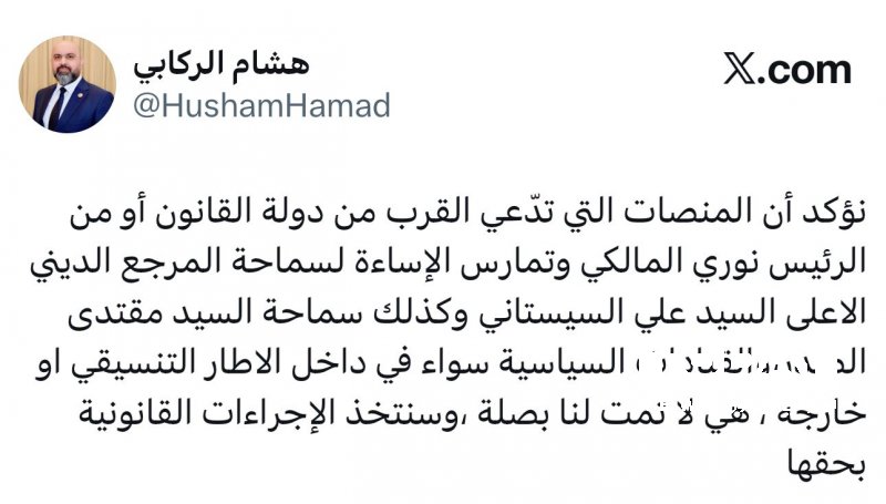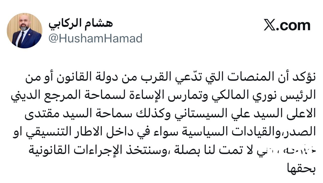 وقال الركابي في تدوينه عبر منصة "أكس"، تابعتها "Today News" إن "المنصات التي تدّعي القُرب من دولة القانون أو من الرئيس نوري المالكي وتمارس الإساءة لسماحة المرجع الديني الأعلى السيد علي السيستاني، وكذلك سماحة السيد مقتدى الصدر، والقيادات السياسية سواء داخل الإطار التنسيقي أو خارجه، هي لا تمتّ لنا بصلة".