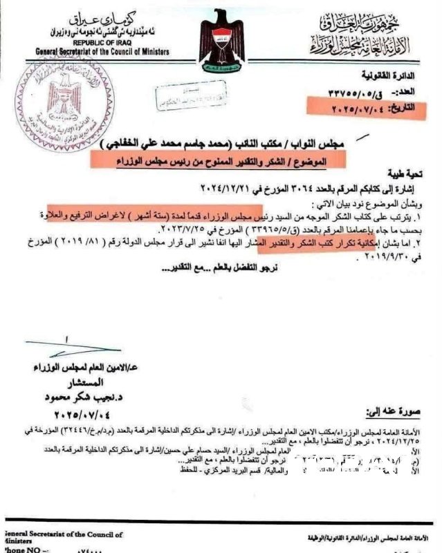 أظهرت وثيقة صادرة عن وزارة الماليّة رداً على كتاب الأمانة العامة لمجلس الوزراء بشأن آليّة احتساب كتب الشكر والتقدير الممنوحة من رئيس الوزراء للموظّفين، موضحةً أنّ كتاب الشكر الواحد يُعدّ خدمة لمدّة (6) أشهر، وأنّ كتابي شكر يُحتسبان خدمة سنة كاملة، على أن يُرحَّل أي كتاب شكر ثالث يصدر خلال السنة نفسها ليُحتسب على السنة التي تليها.