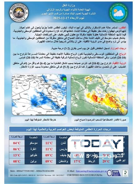 وتشير التوقعات إلى تشكل ضباب متوسط إلى كثيف خلال ساعات الصباح في مناطق متفرقة من الوسط والجنوب، ما يؤدي إلى تدهور واضح في مدى الرؤية الأفقية، قبل أن يتلاشى تدريجياً خلال ساعات الظهيرة. كما تسجل درجات الحرارة انخفاضاً طفيفاً بمعدل (2–3) درجات مئوية مقارنة بيوم أمس، فيما تكون الرياح متقلبة الاتجاه وخفيفة إلى معتدلة السرعة في عموم البلاد.