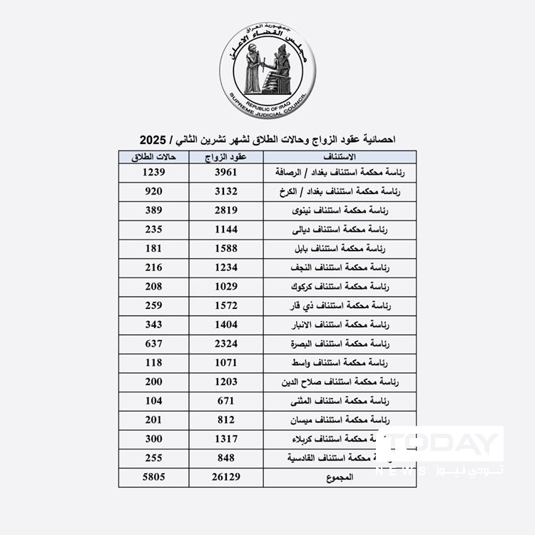 أعلن مجلس القضاء الأعلى إحصائية عقود الزواج وحالات الطلاق لشهر تشرين الثاني 2025، حيث سجّلت محاكم بغداد أعلى الأرقام بين المحافظات، مع تسجيل 3961 عقد زواج و1239 حالة طلاق في الرصافة، و3132 عقد زواج مقابل 920 طلاق في الكرخ.