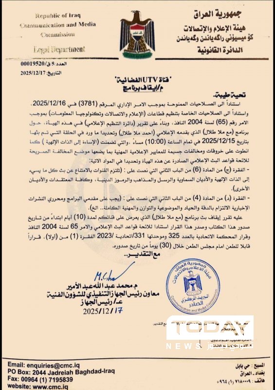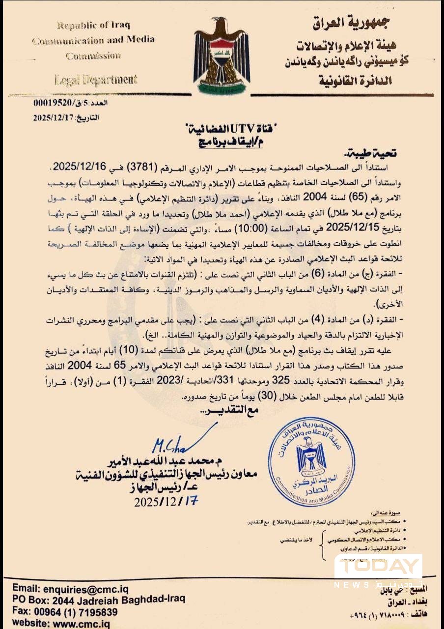 أصدرت هيئة الإعلام والاتصالات العراقية، عبر دائرتها القانونية، قراراً يقضي بإيقاف بث برنامج “مع ملا طلال” الذي يقدمه الإعلامي أحمد ملا طلال على قناة UTV الفضائية لمدة 10 أيام، وذلك على خلفية مخالفات جسيمة لقواعد البث الإعلامي والمعايير المهنية المعتمدة.