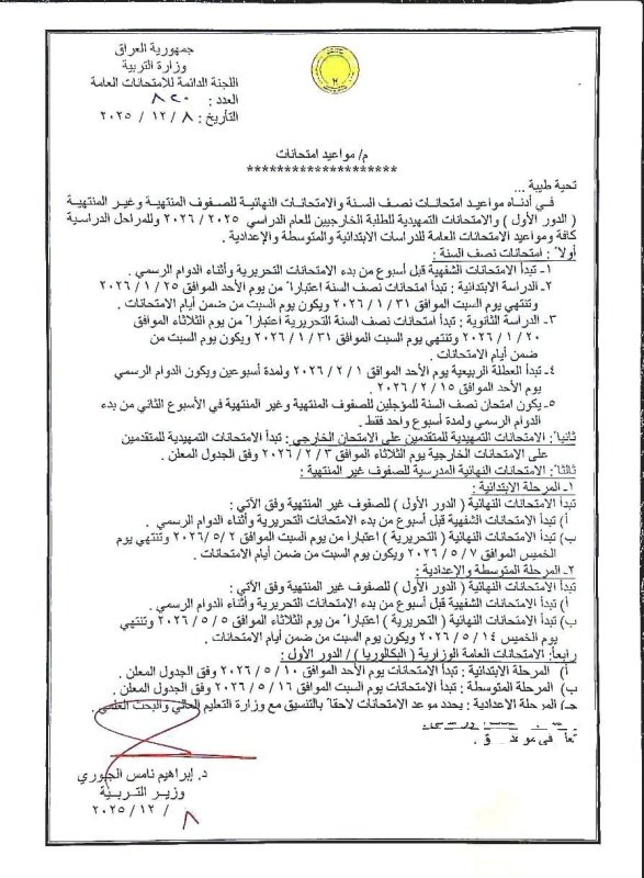 وأعلنت وزارة التربية مواعيد امتحانات نصف السنة والامتحانات النهائية للصفوف المنتهية وغير المنتهية (الدور الأول) والامتحانات التمهيدية للطلبة الخارجيين للعام الدراسي 2025 / 2026 وللمراحل الدراسية كافة، وفق الجدول أدناه: