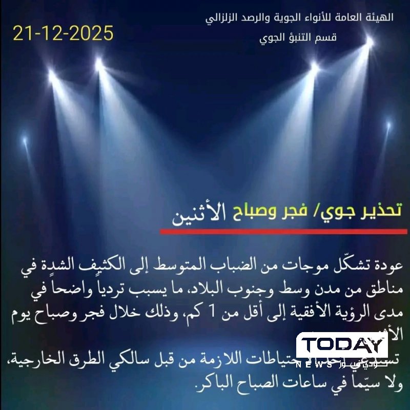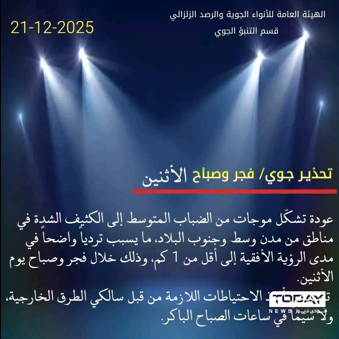 وقالت الهيئة في بيان لها ، ان "موجات من الضباب المتوسط إلى الكثيف الشدة في ستعود تتشكل في مناطق من وسط وجنوب البلاد، ما يسبب ترديا واضحا في مدى الرؤية الأفقية إلى أقل من 1 كم، وذلك خلال فجر وصباح يوم الاثنين".