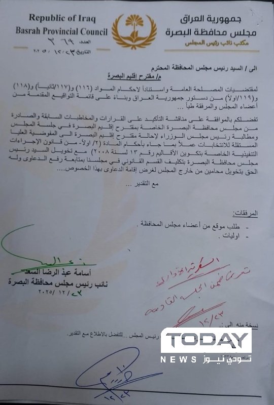 وجّه رئيس مجلس محافظة البصرة، خلف البدران، بحسب وثيقة صادرة عن المجلس ، اليوم الأربعاء ، بإدراج فقرة "مقترح إقليم البصرة" ضمن جدول أعمال الجلسة المقبلة للمجلس.