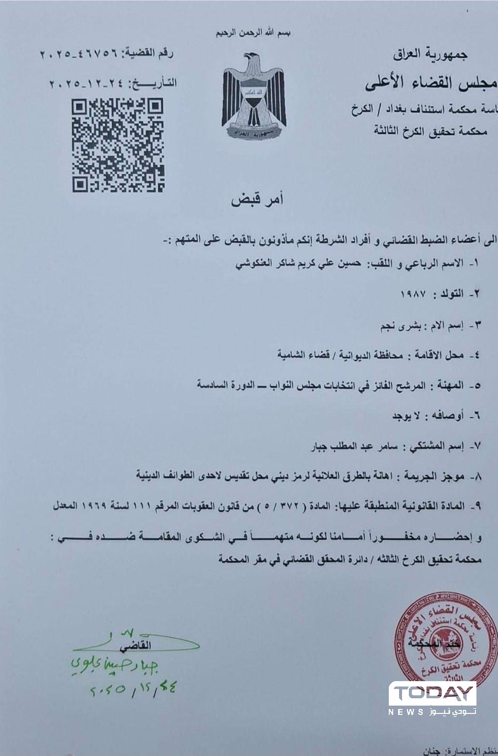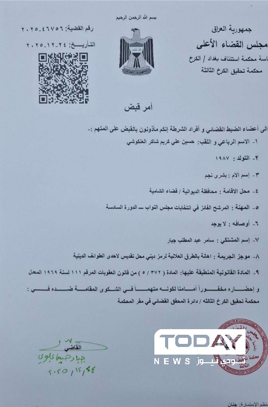 القضاء يصدر أمر قبض بحق "العنكوشي" مرشح فائز بالانتخابات (وثيقة)