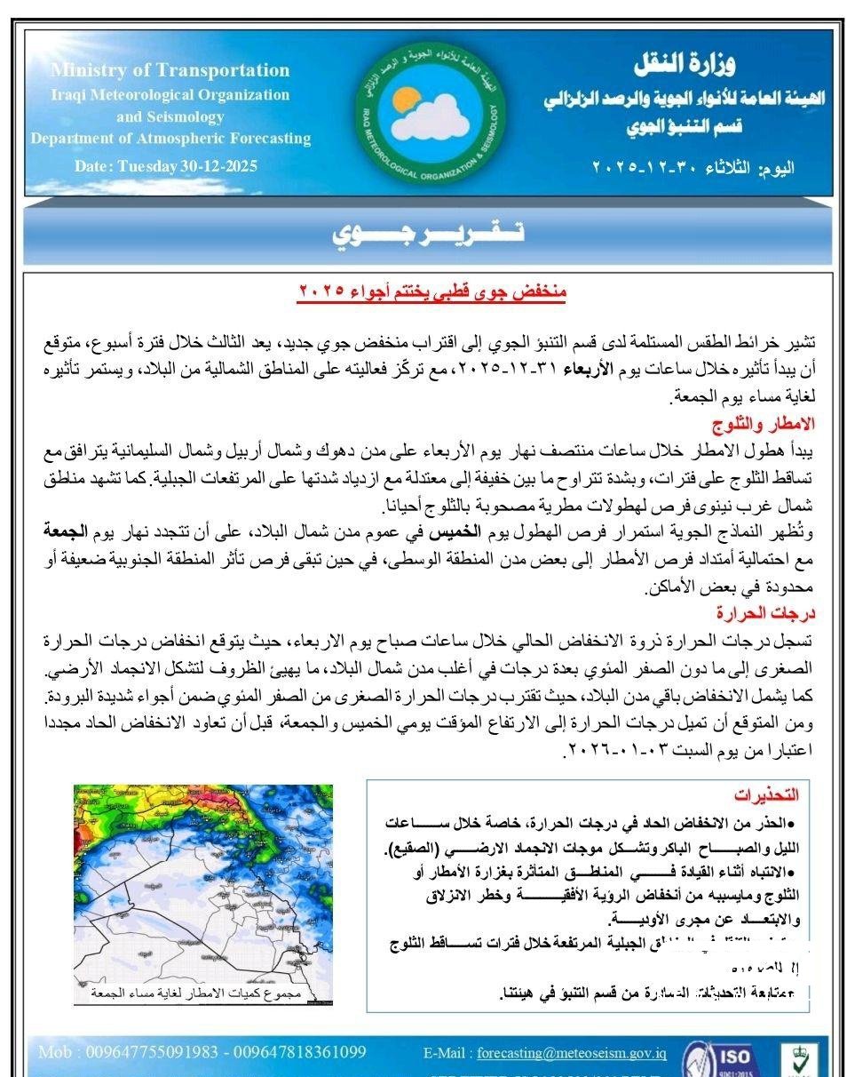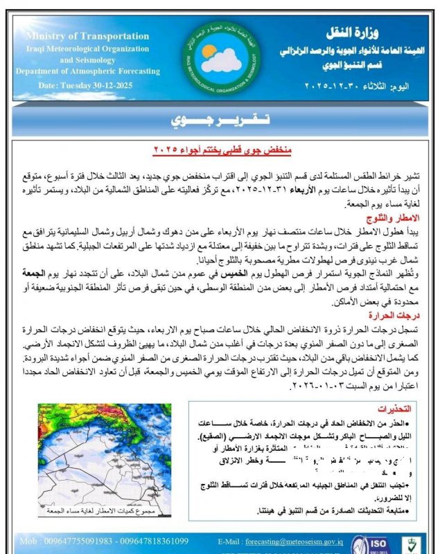 وذكرت الهيئة في تقرير لها ، أن "خرائط الطقس تشير إلى اقتراب منخفض جوي قطبي، هو الثالث خلال أسبوع، يبدأ تأثيره من يوم غد الأربعاء الموافق 31-12-2025 ويستمر لغاية مساء الجمعة، مع تركز فعاليته في المناطق الشمالية".