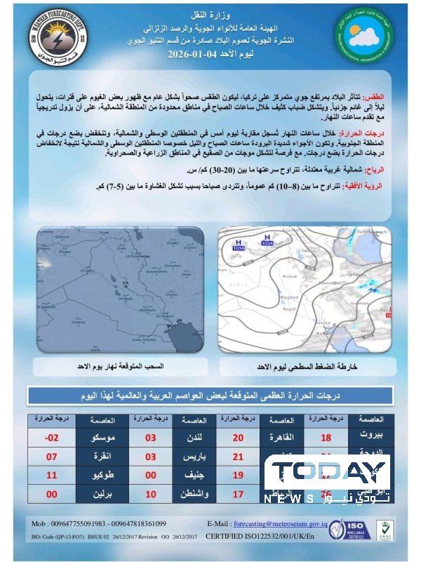 توقعت الهيئة العامة للأنواء الجوية والرصد الزلزالي، اليوم الأحد ، طقسًا صحوًا عمومًا بتأثير مرتفع جوي متمركز على تركيا، مع غيوم متفرقة وضباب صباحي شمالًا يزول تدريجيًا، وانخفاض طفيف في درجات الحرارة جنوبًا، وأجواء شديدة البرودة صباحًا وليلًا مع فرص لتشكل الصقيع.