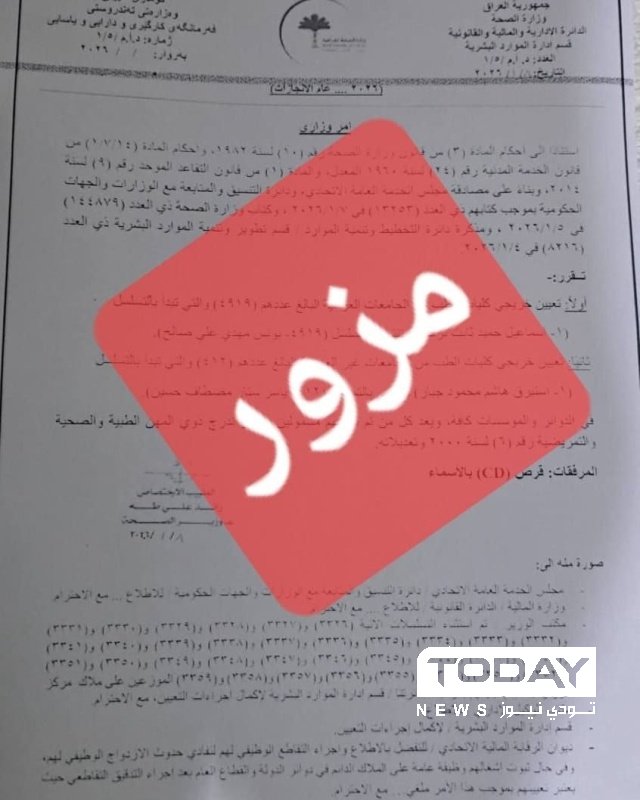 نفت وزارة الصحة اليوم الاحد ، وثيقة متداولة منسوبة لوزارة الصحة كقرار وزاري لتعيين اكثر من 9 الاف شخص من خريجي كليات الطب العربية وغير العربية.