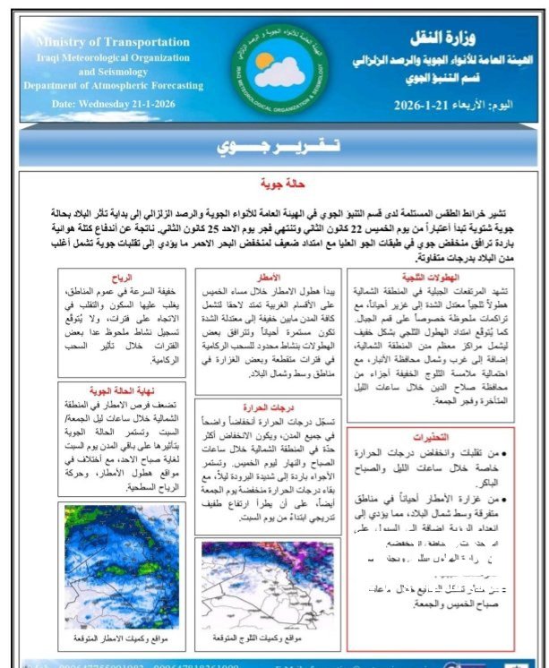 وذكرت الهيئة في بيان لها ، أن "خرائط الطقس المستلمة لدى قسم التنبؤ الجوي في الهيئة العامة للأنواء الجوية والرصد الزلزالي تشير إلى بداية تأثر البلاد بحالة جوية شتوية تبدأ اعتباراً من يوم الخميس 22 كانون الثاني وتنتهي فجر يوم الأحد 25 كانون الثاني".