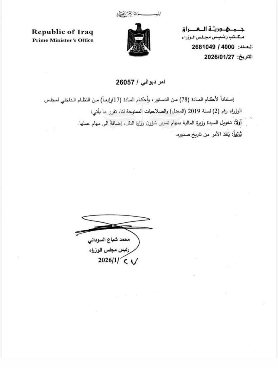 وتضمنت وثيقة صادرة من رئاسة الوزراء، امر ديواني يقضي بتكليف طيف سامي بمنصب وزيرة النقل بالوكالة إضافة الى مهامها كوزيرة للمالية.