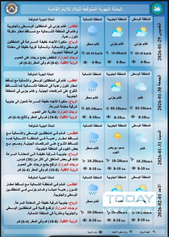 أعلنت هيئة الانواء الجوية، اليوم الاربعاء ، حالة الطقس في البلاد خلال الايام المقبلة، فيما اشارت الى فرص هطول امطار رعدية وانخفاض بدرجات الحرارة اعتباراً من يوم غدٍ الخميس.