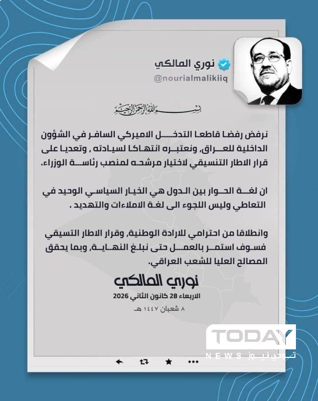 المالكي: نرفض التدخل الأمريكي السافر في الشأن الداخلي العراقي