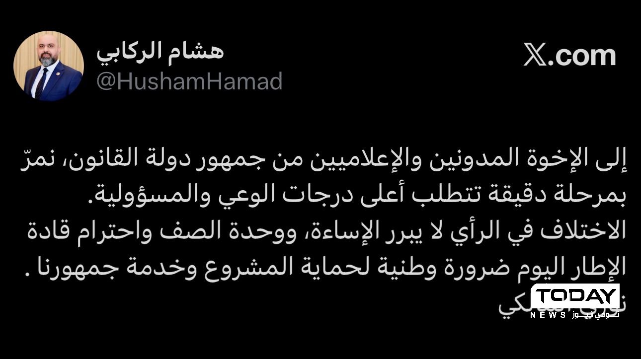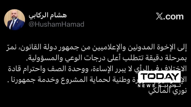 وقال الركابي في تدوينة له على منصة (X) ، ان "رئيس الائتلاف نوري المالكي خاطب المدونين والإعلاميين من جمهور دولة القانون بالقول (نمرّ بمرحلة دقيقة تتطلب أعلى درجات الوعي والمسؤولية)".