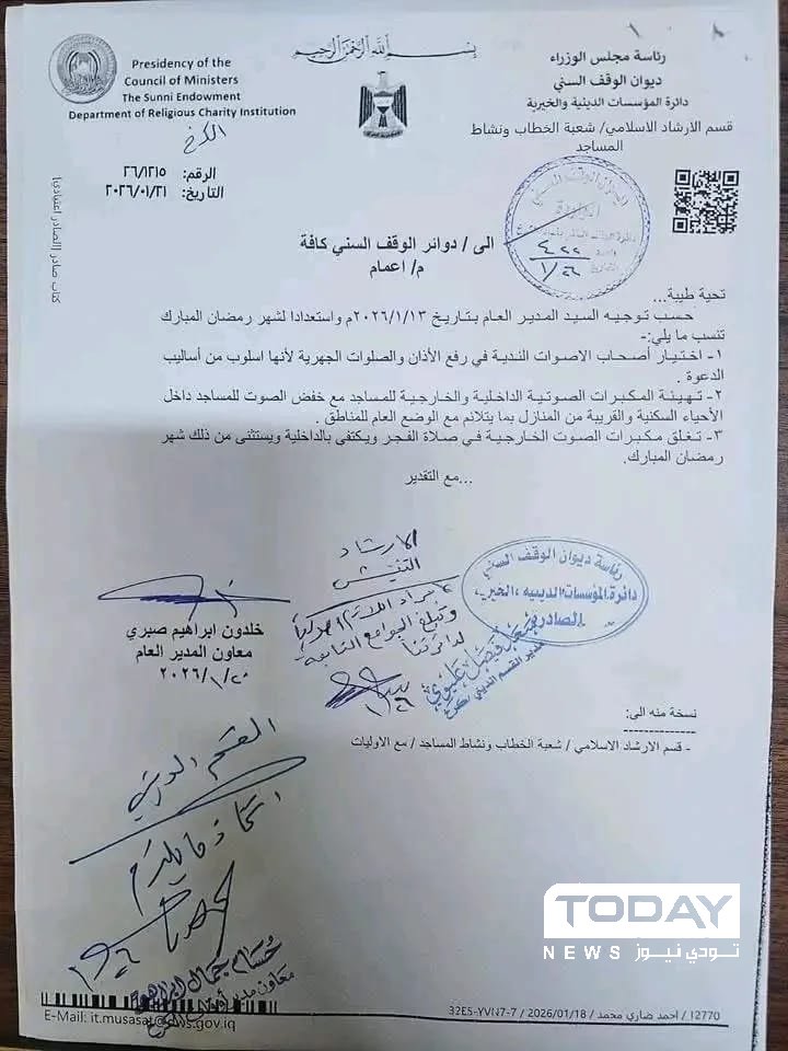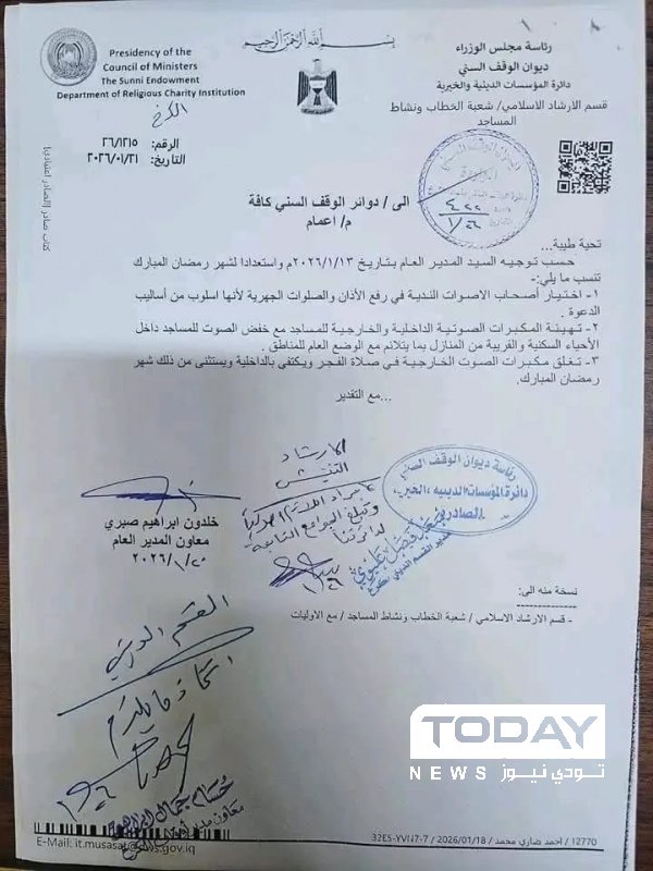 وكشف كتاب رسمي، صادر عن ديوان الوقف السني وموجّه إلى دوائر الوقف كافة، عن صدور توجيهات تقضي بخفض أصوات مكبرات الصوت في المساجد الواقعة داخل الأحياء السكنية والقريبة من المنازل، مع التأكيد على اختيار الأصوات الندية في رفع الأذان والصلوات الجهرية خلال شهر رمضان المقبل.