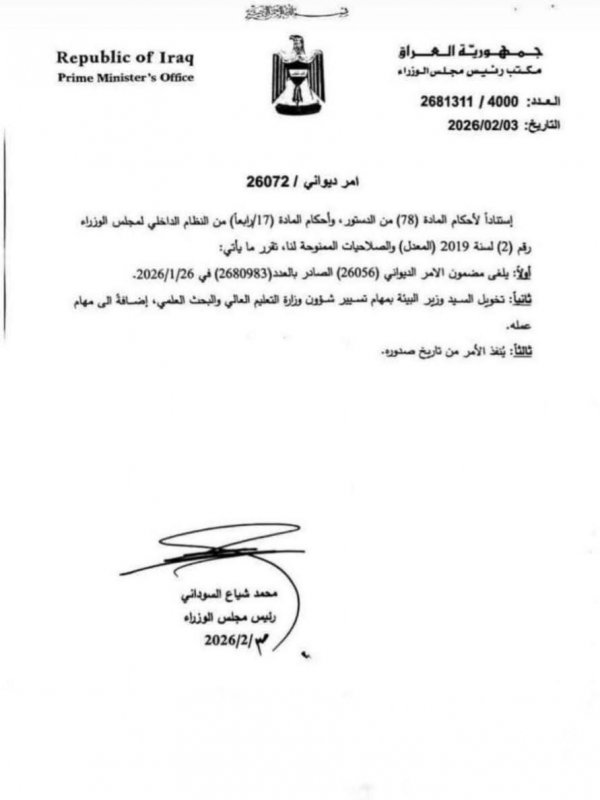 وبحسب اامر ديواني رسمي أكد ان "السوداني قرر تخويل وزير البيئة بمهام تسيير شؤون وزارة التعليم العالي اضافة الى مهام عمله".
