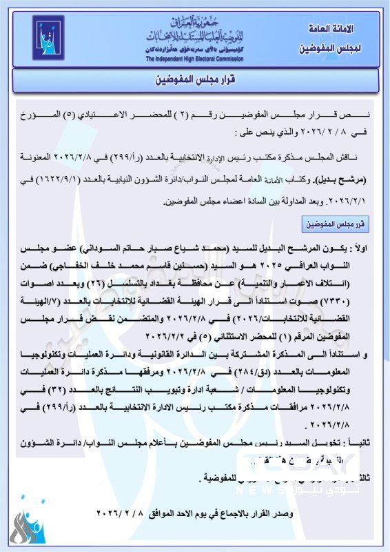أعلنت المفوضية العليا المستقلة للانتخابات، اليوم الأحد، أن المرشح الفائز حسنين الخفاجي سيكون بديلاً عن المرشح الفائز محمد شياع السوداني في مجلس النواب.