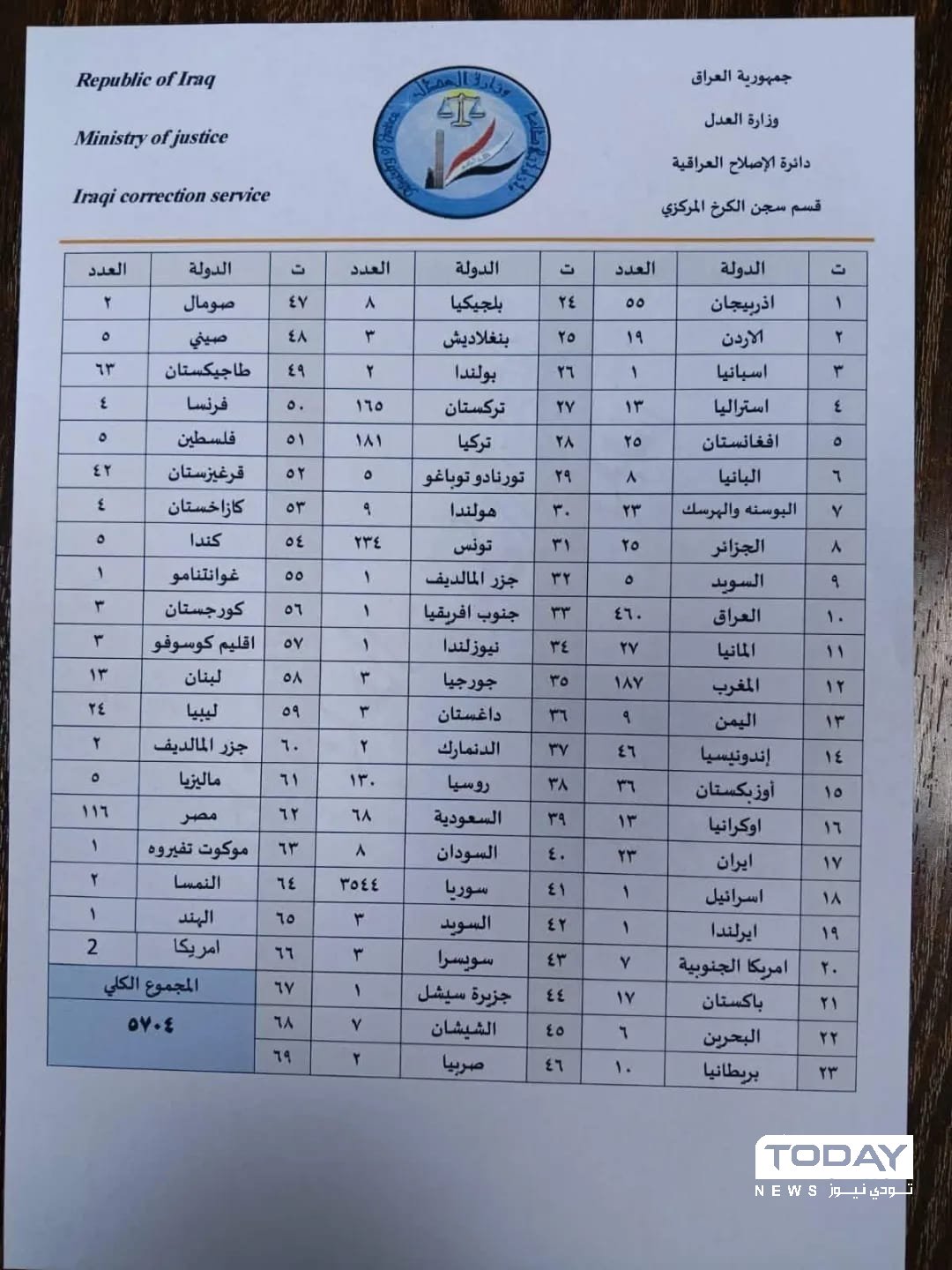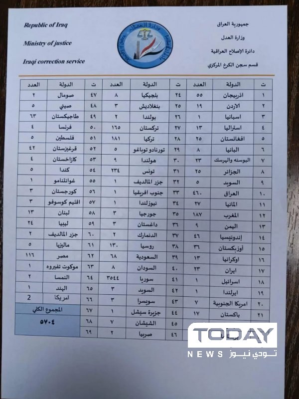 أظهرت وثيقة صادرة عن وزارة العدل - دائرة الإصلاح العراقية -إحصائية بأعداد النزلاء الأجانب والعرب من عناصر داعش المودعين في السجون، وموزعين بحسب جنسياتهم.