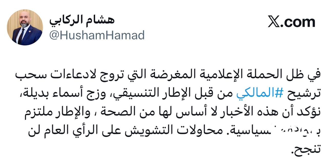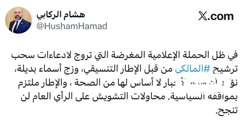 وقال مدير المكتب الإعلامي لرئيس ائتلاف دولة القانون، هشام الركابي في تدوينة على منصة (إكس)، إنه "في ظل الحملة الإعلامية المغرضة التي تروج لادعاءات سحب ترشيح المالكي من قبل الإطار التنسيقي وزج أسماء بديلة، نؤكد أن هذه الأخبار لا أساس لها من الصحة".
