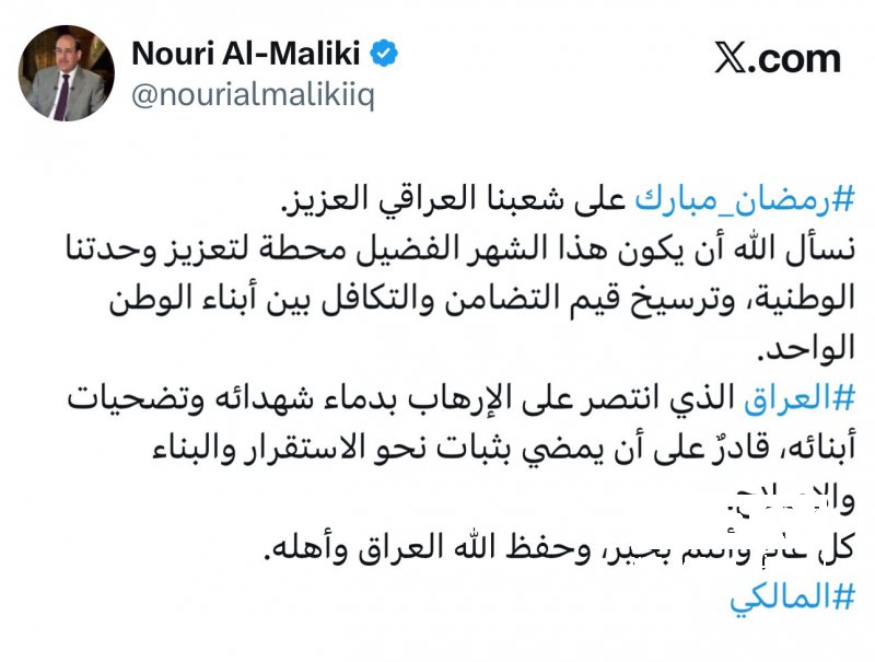 وقال المالكي، في تدوينة له على منصة "X" ، "رمضان مبارك على شعبنا العراقي العزيز، نسأل الله أن يكون هذا الشهر الفضيل محطة لتعزيز وحدتنا الوطنية، وترسيخ قيم التضامن والتكافل بين أبناء الوطن الواحد".