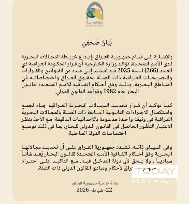 أكدت وزارة الخارجية، اليوم الأحد ، أن قرار الحكومة العراقية المرقم 266 لسنة 2025 بشأن إيداع خريطة المجالات البحرية لدى الأمم المتحدة استند إلى القوانين والتصريحات الوطنية ذات الصلة بحقوق العراق واختصاصاته في المناطق البحرية.