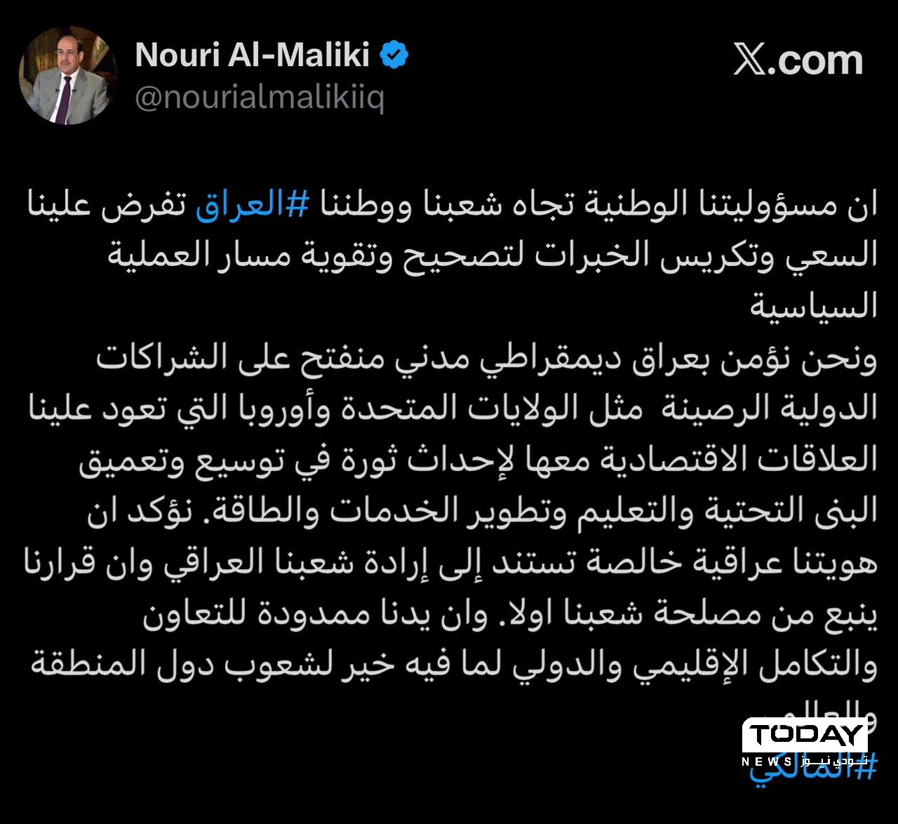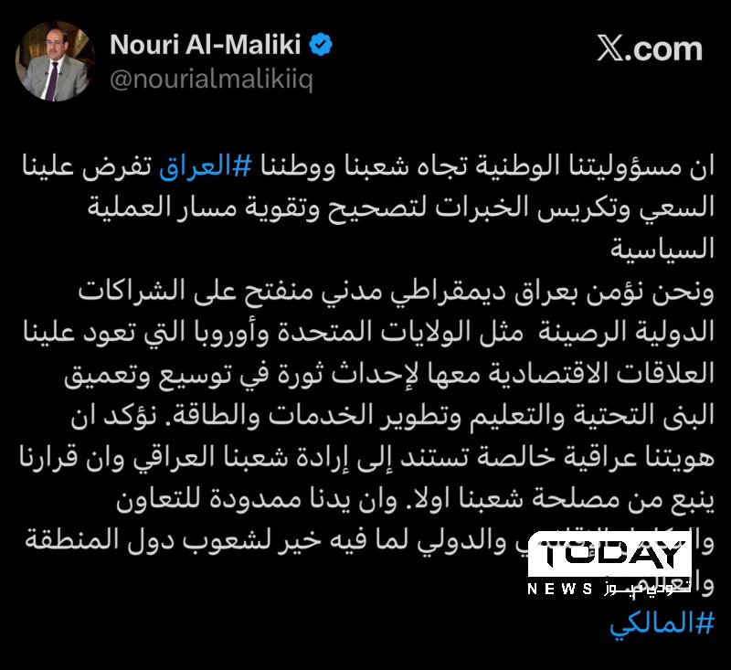 وأضاف المالكي في تدوينة له على منصة X ، ان "مسؤوليتنا الوطنية تجاه شعبنا ووطننا العراق، تفرض علينا السعي وتكريس الخبرات لتصحيح وتقوية مسار العملية السياسية"، لافتا الى "اننا نؤمن بعراق ديمقراطي مدني منفتح على الشراكات الدولية الرصينة مثل الولايات المتحدة وأوروبا التي تعود علينا العلاقات الاقتصادية معها لإحداث ثورة في توسيع وتعميق البنى التحتية والتعليم وتطوير الخدمات والطاقة".
