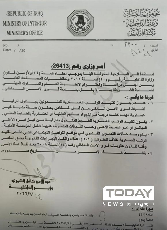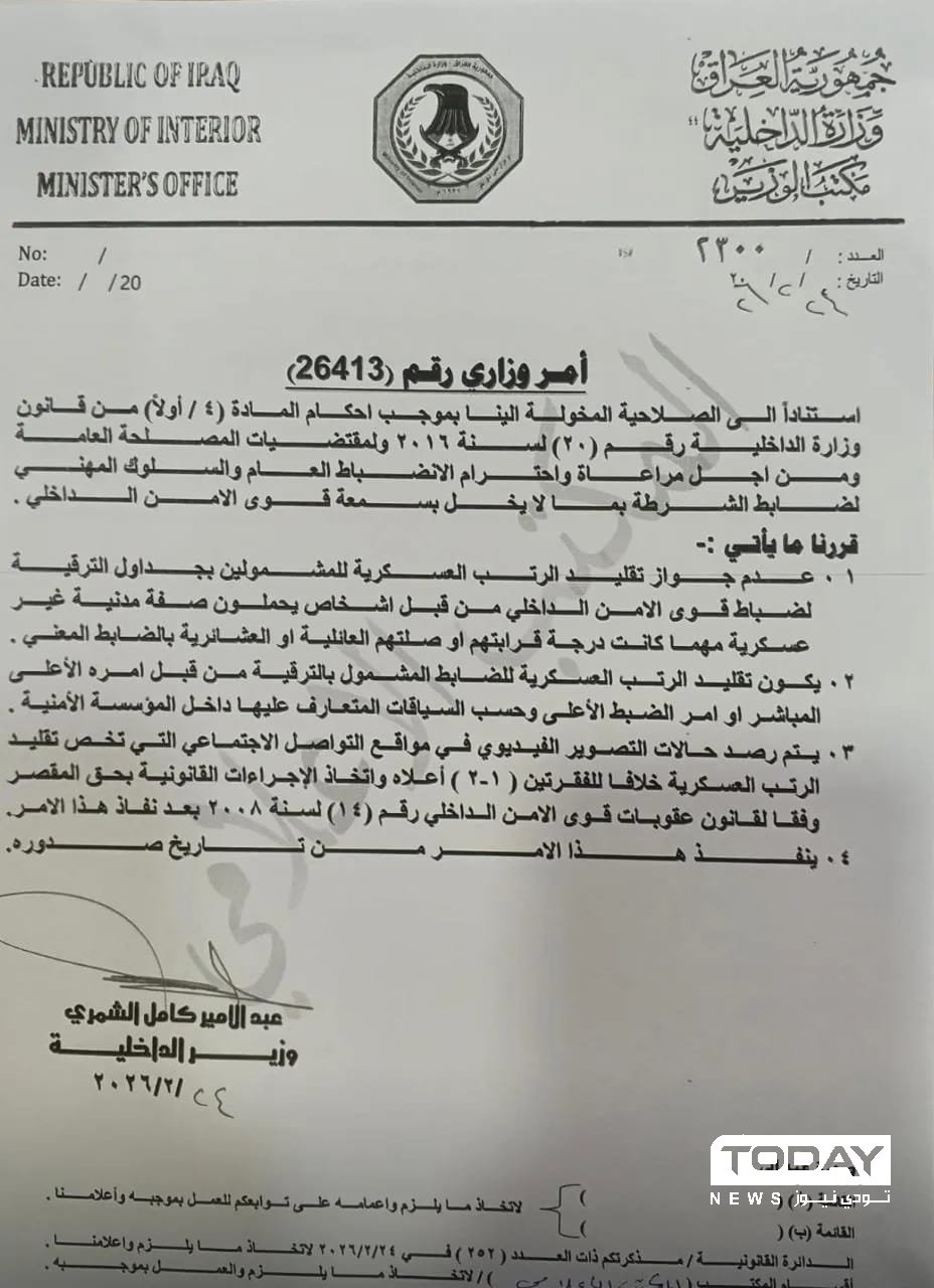 ووفقا لكتاب رسمي مذيل بتوقيع وزير الداخلية عبد الامير الشمري بتاريخ 24 من شهر شباط/فبراير الجاري، فإنه "قرر عدم جواز تقليد الرتب العسكرية للمشمولين بجداول الترقية لضباط قوى الأمن الداخلي من قبل أشخاص يحملون صفة مدنية غير عسكرية مهما كانت درجة قرابتهم أو صلتهم العائلية او العشائرية بالضابط المعني".