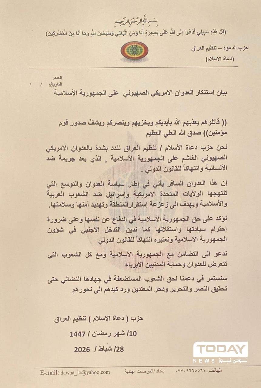 استنكر حزب دعاة الاسلام ،اليوم السبت، العدوان الصهيوأمريكي على جمهورية ايران الإسلامية ، مؤكدا ان هذا العمل يمثل جريمة ضد الإنسانية، وانتهاكا للقانون الدولي .