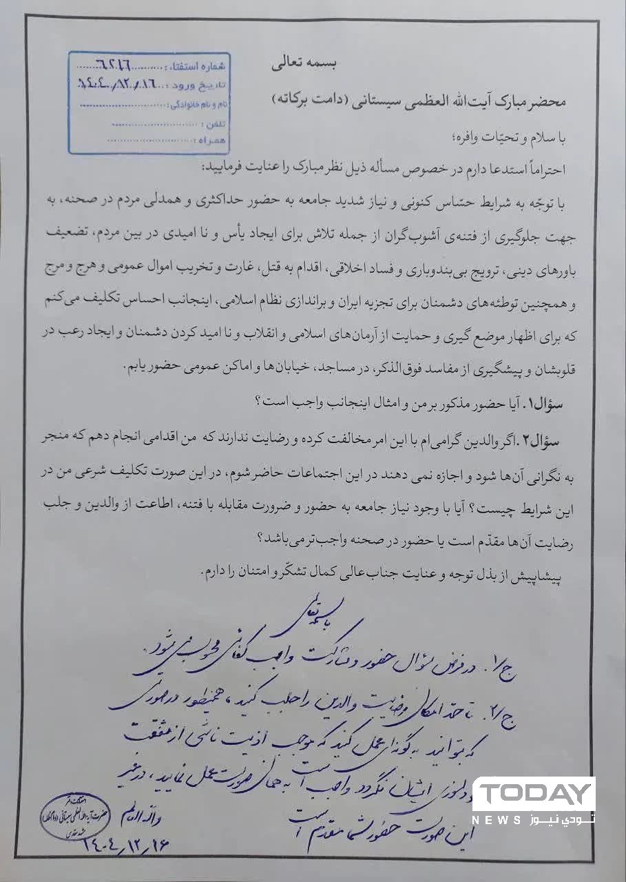 أظهرت وثيقة متداولة، اليوم الأحد، استفتاءً موجهاً إلى المرجع الديني الأعلى آية الله علي السيستاني، ورد باللغة الفارسية من مواطن إيراني، يتضمن تساؤلات بشأن حكم حضور المؤمنين في التجمعات العامة في ظل ما وصفه السائل بـ"الظروف الحساسة".