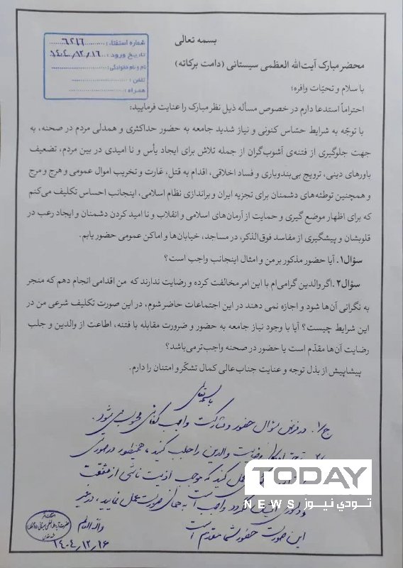 وتُظهر الوثيقة أن تاريخ ورود الاستفتاء إلى مكتب المرجعية كان في 11 إسفند 1404 وفق التقويم الهجري الشمسي (الفارسي)، الموافق 2 مارس / آذار 2026.