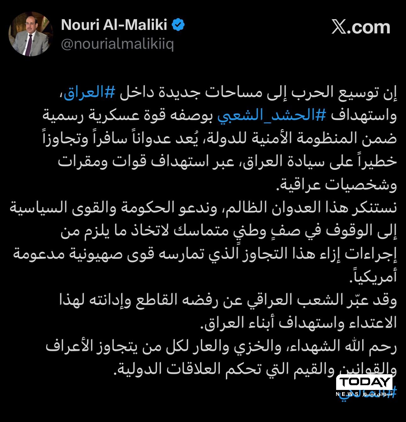 وقال المالكي في تدوينة له ، إن "توسيع الحرب إلى مساحات جديدة داخل العراق، واستهداف الحشد الشعبي بوصفه قوة عسكرية رسمية ضمن المنظومة الأمنية للدولة، يُعد عدواناً سافراً وتجاوزاً خطيراً على سيادة العراق، عبر استهداف قوات ومقرات وشخصيات عراقية".