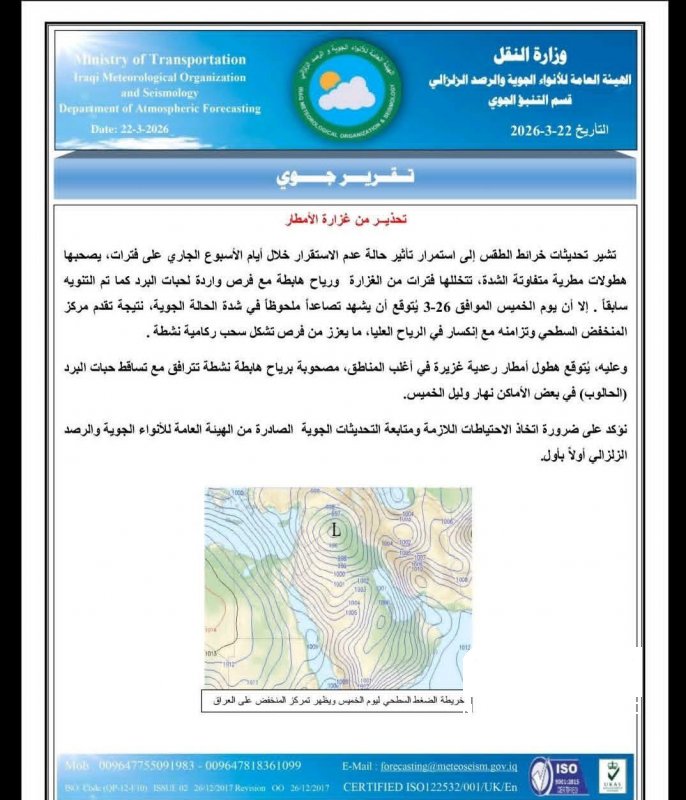 حذرت الهيئة العامة للأنواء الجوية والرصد الزلزالي،اليوم الأحد، من استمرار تأثير حالة عدم الاستقرار الجوي خلال الأسبوع الجاري، مع هطولات مطرية متفاوتة الشدة ورياح هابطة، وفرص لتساقط حبات البرد في بعض المناطق.