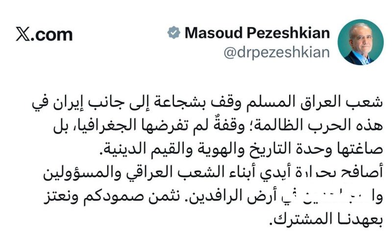 وقال بزشكيان بتغريدة على حسابه في منصة "أكس"، وتابعته "بغداد اليوم"، إن "شعب العراق المسلم وقف بشجاعة إلى جانب إيران في هذه الحرب الظالمة وقفةٌ لم تفرضها الجغرافيا، بل صاغتها وحدة التاريخ والهوية والقيم الدينية".